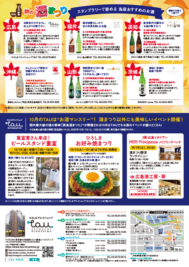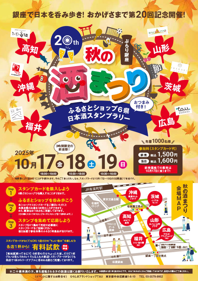 今回もTAU(広島)をはじめ合計6店が参加。各県自慢のお酒とおつまみを楽しみながら銀座を回遊する、日本酒ファンにはたまらないイベントです。スタンプカードはお得な前売価格で現在発売中!皆様のご参加を心からお待ちしています!